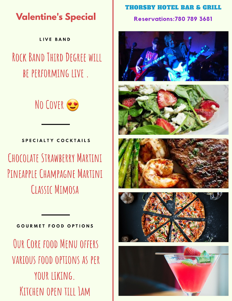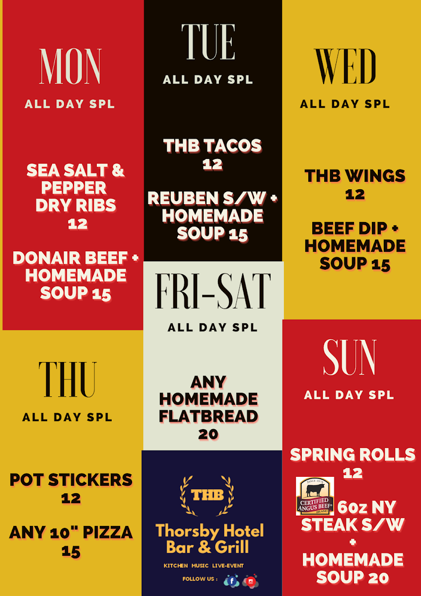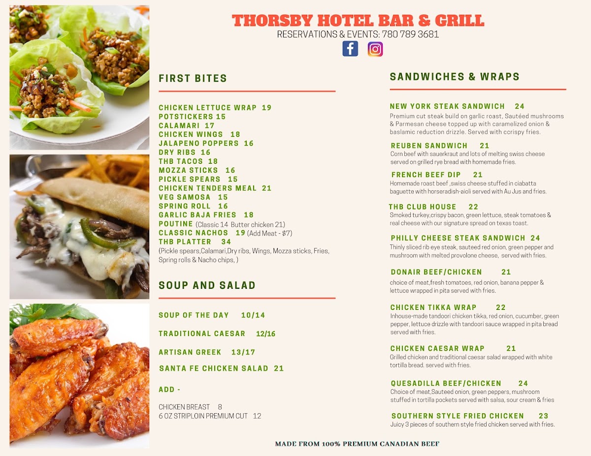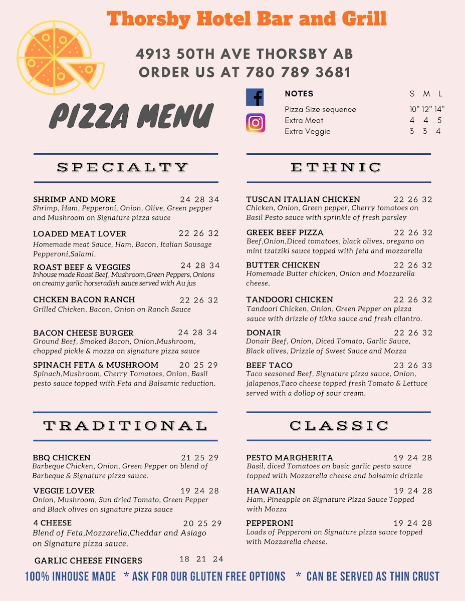The menu at Thorsby Hotel Bar & Grill Kitchen Music Social offers a wide variety of options to satisfy any palate. For starters, diners can enjoy flavorful bites like Chicken Lettuce Wrap, Potstickers, and Jalapeno Poppers, each with its own unique appeal. Soups and salads are also a great way to begin, with choices like the Soup of the Day (available in both half and full portions) or a classic Traditional Caesar Salad. For those craving something heartier, the selection of Sandwiches and Wraps is sure to impress, including favorites like the New York Steak Sandwich and Philly Cheese Steak Sandwich. When it comes to gourmet burgers, options such as the Bacon Cheddar and Chicken Pesto burgers bring bold flavors to the table. Meat lovers can indulge in a variety of steak dinners, including the Peppercorn and Rib Eye Garlic Confit steaks. The mains section is just as tempting, with hearty dishes like Spaghetti Meatsauce and BBQ Pork Ribs. For pizza enthusiasts, there is something for everyone, from the Shrimp and More specialty pizza to the BBQ Chicken and Veggie Lover traditional pizzas. The Tuscan Italian Chicken ethnic pizza and the Pesto Margherita classic pizza also offer delightful variations to enjoy. With a broad selection of flavors and options, the menu at Thorsby Hotel Bar & Grill Kitchen Music Social is perfect for any occasion.